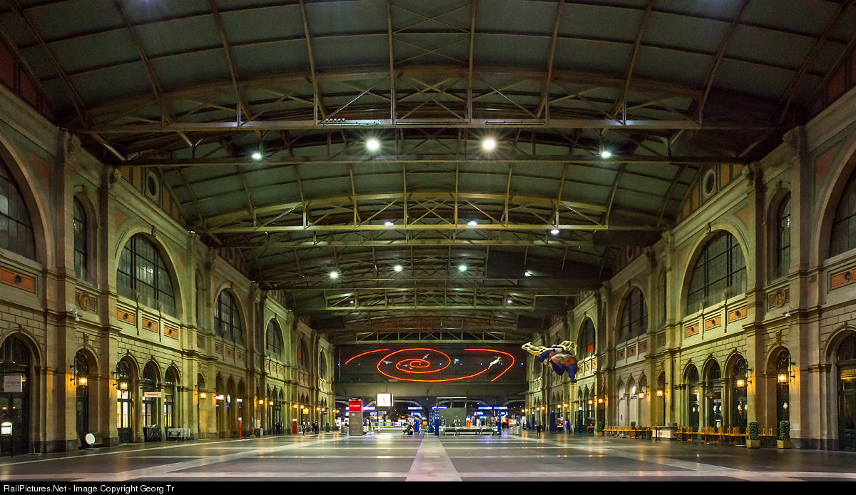 A very seldom view, the large hall of Zürich mainstation empty, but this is monday morning at 05.49 AM. About 430 000 people are using Switzerlands most frequented station, with nearly 3000 trains a day. This large hall was built in 1871 and had 6 tracks till the position of the photographer. The red spiral is an artwork "The Philosopher`s Egg" by Mario Merz. On the right, seen from the back, "L’ange protecteur" (guardian angel) by Nikki de Saint Phalle.