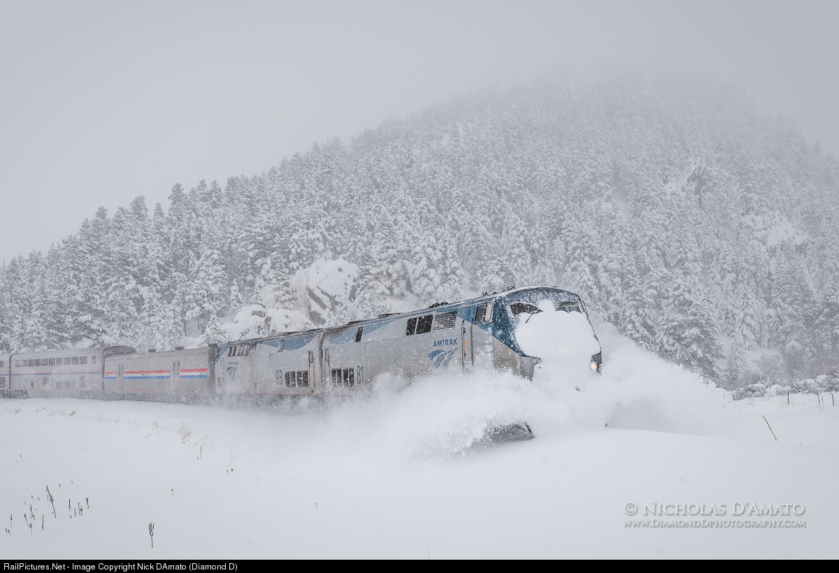 This past weekend Colorado got a doozie of a spring snowstorm. Denver only saw a few inches of accumulation due to melting, but just a few miles outside of town as the tracks enter the foothills near Tunnel 1, the snow was light and fluffy and piling up. Amtrak's westbound California Zephyr was the first train through this stretch of track in at least a few hours, so #5 was plowing the line as they cruised upgrade.