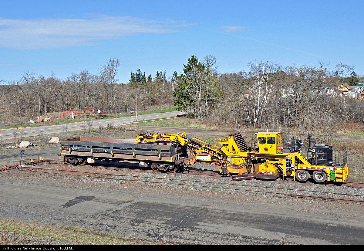 While perhaps not the most glamourous or breathtaking railroad photo ever but a photo of a behind the scenes piece of essential railroad equipment that's keeps the trains moving-safely and efficiently. The Knox- Kershaw yard cleaner with it's Cummins 240hp Tier 3 motor and 60 feet of highly efficient yard cleaning machine technology consisting of a ballast broom, bucket elevator system and conveyor plus more goodies not to mention a air conditioned, sound insulated, comfortable operator’s seat to get the job done. CN is currently using this particular machine to remove the taconite pellets from between the rails that fall, roll, or otherwise spill off the ore cars as they leave the U.S. Steel Minntac plant on the CN Minntac Sub.