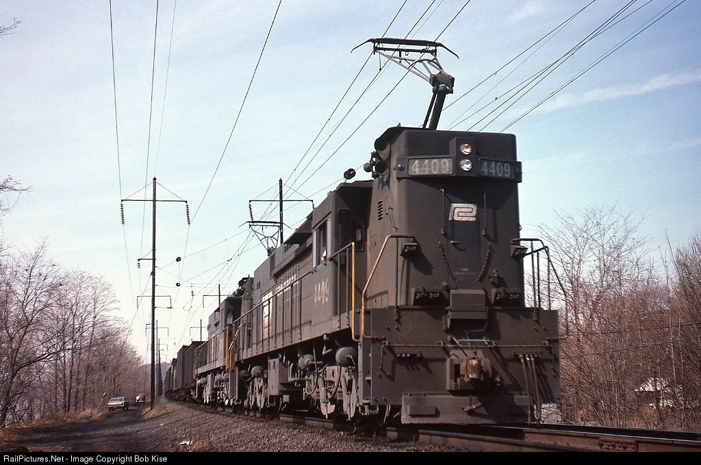 Two E-44s, still in their Penn Central paint scheme, lead an eastbound mineral train through Port Interlocking. The 4409 was built by GE for the PRR in April, 1961.