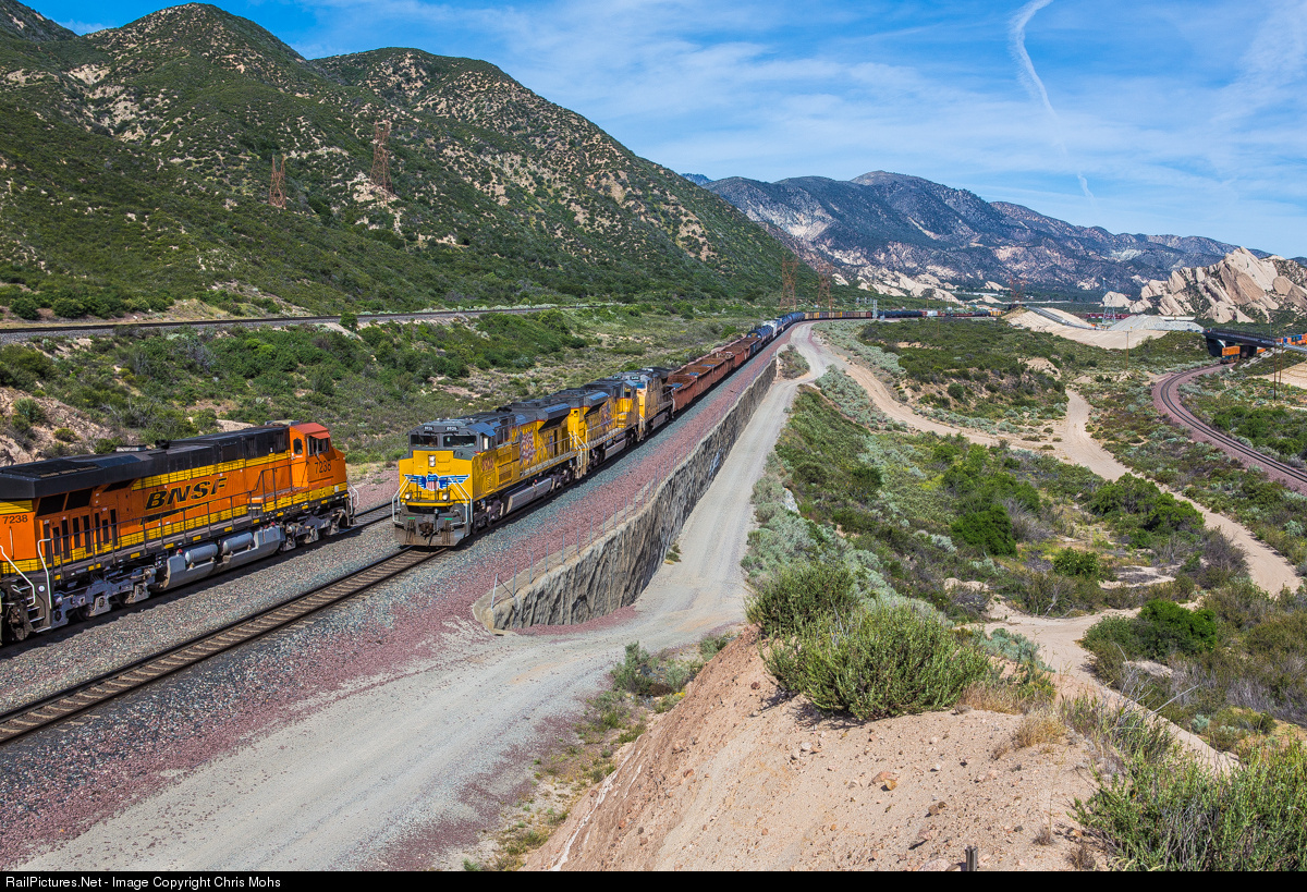 Eastbound BNSF ES44DC No. 7238 on main 1, meets westbound UP SD70ACe No. 8826 on main 2 with a mixed manifest, while on main 3 a BNSF stack is just clearing HWY 138 overpass.