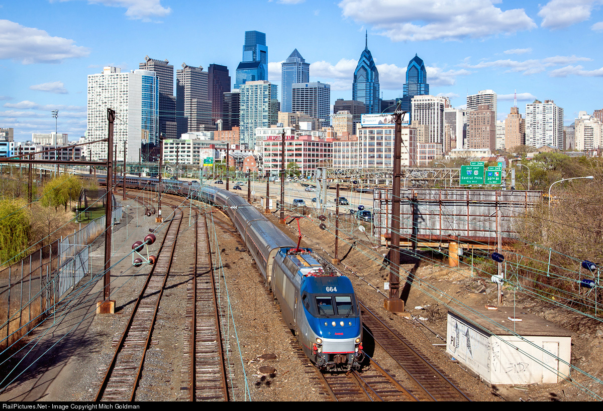 An Amtrak long distance train, led by a then in service HHP-8, departs Philadelphia, southbound for Washington DC and points south. These locomotive's original type designation was "HHL-8" for HighHorsepower Locomotive - 8,000 horsepower. Rumor has it, management changed the name to HHP-8 after it was heard some employees were substituting the "L" for "Lousy". Amtrak's HHP-8's suffered from low reliability and as a result, the fleet of 15 had been retired by Amtrak within 15 years, the last motor retired (by Amtrak) on November 7, 2014.