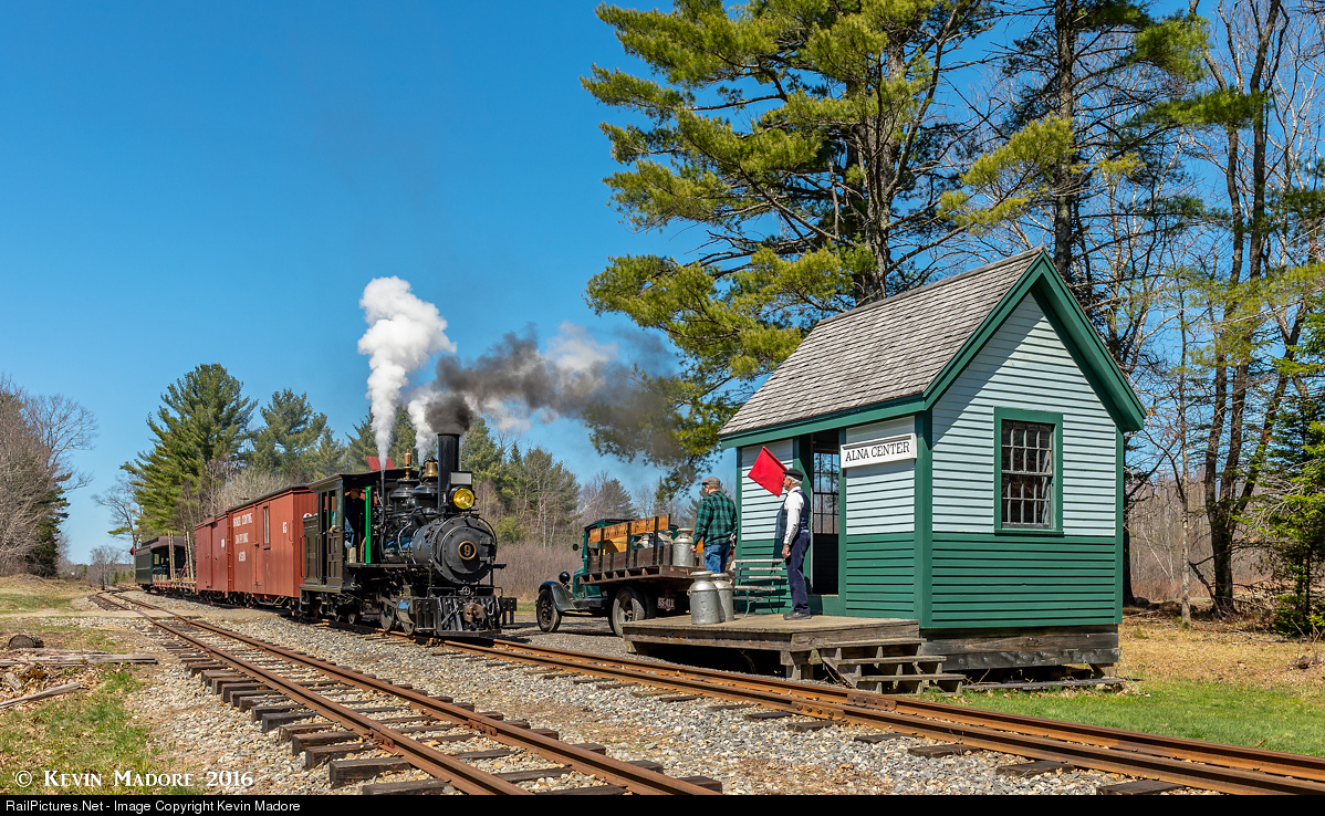 Station Stop: Alna Center. A WW&F mixed train observes the red flag displayed at the tiny station in Alna Center, Maine and slows for a station stop to load locally produced milk, bound for the Turner Center Creamery just over 6 miles to the south in Wiscasset. The Station Agent and a Railroad Courier prepare to make short work of the loading operation and exchange of the necessary paperwork.