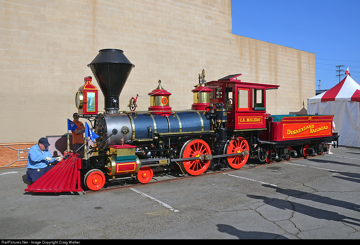 Disneyland Railroad 4-4-0 #1, the "C.K. Holliday," was constructed by the Walt Disney Studio in 1954 and entered service on the Santa Fe & Disneyland Railroad at Disneyland on Opening Day, July 17, 1955. The 36" gauge engine is named for Cyrus Kurtz Holliday, founder of the Santa Fe Railroad in 1859. It was designed to look like Walt Disney's "Lilly Belle" 1/8th scale live-steam model locomotive, which was the inspiration for Disneyland's railroad operation. DRR #1 underwent refurbishment in 2013 and returned to service in January 2016 - just in time for the temporary closing of the railroad due to the construction of the park's new Star Wars Land. The railroad will be rerouted as part of the construction. The engine was on display at the Fullerton Train Station, just a few miles north of Disneyland, for the annual Fullerton Railroad Days celebration.