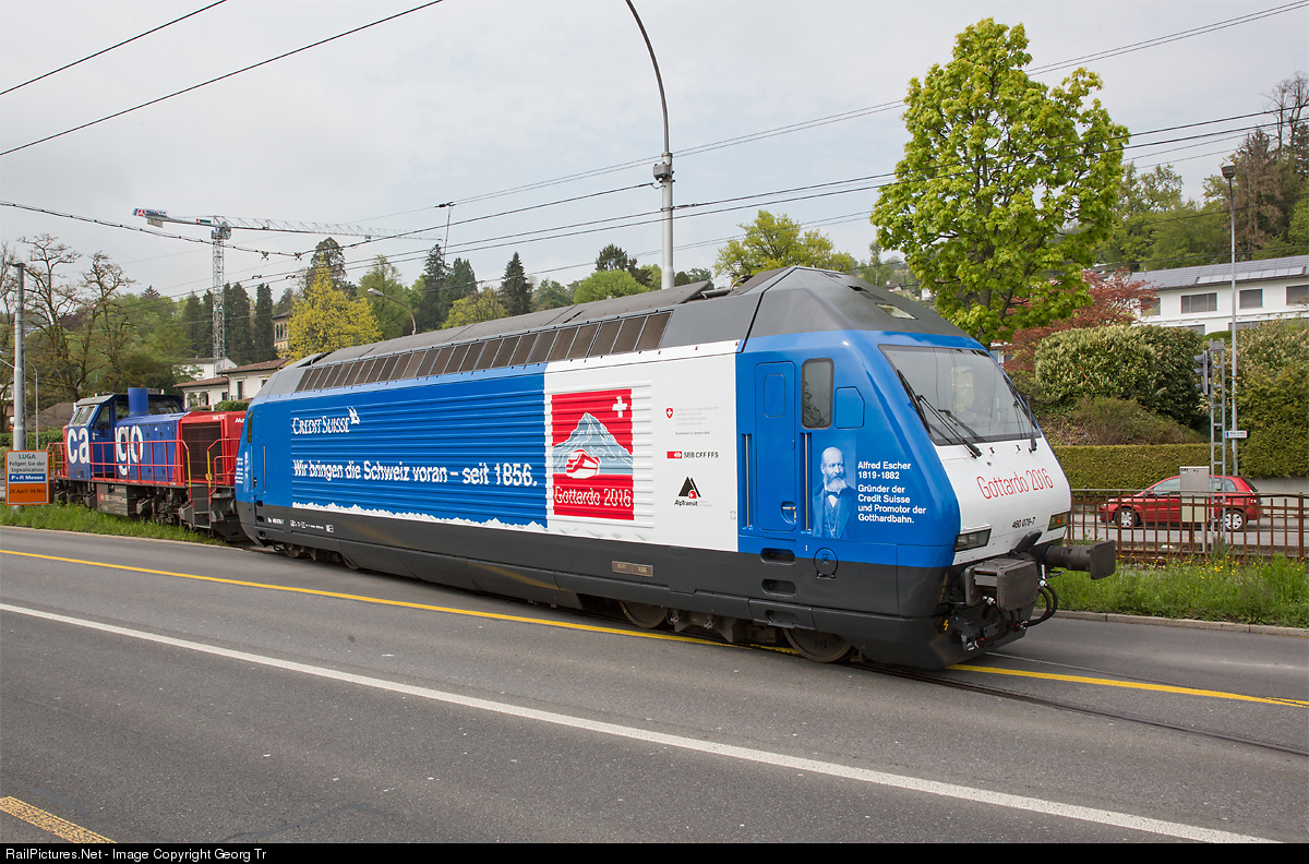 | Diesel locmotive Am 843 # 073 of SBB Cargo is shoving the Re 460 # 079 with publicity paint scheme (adhesives) for the "Crédit Suisse" and Gottardo 2016 from the main track over the Halden road to the siding of the Swiss Museum of Transport (where the launch will take place). The CS bank is one of the main sponsors of the opening ceremonies for the Gotthard Base Tunnel (GBT) in june 2016. |