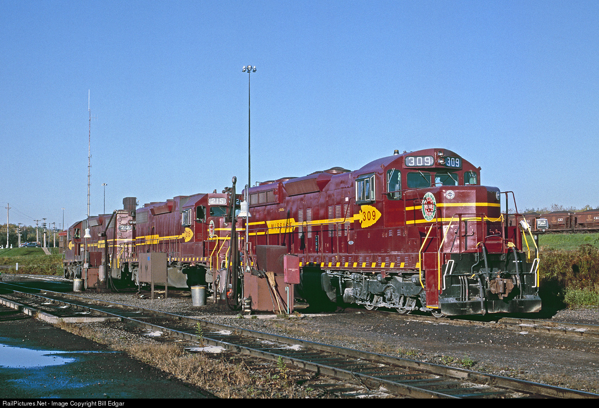 DMIR 309, an SDM (rebuilt from an SD18) is mated up with SD38-2s 215 and 212 at Two Harbors, MN between runs on a pleasant late afternoon in October 1990. The 215 was originally a Bessemer & Lake Erie unit.