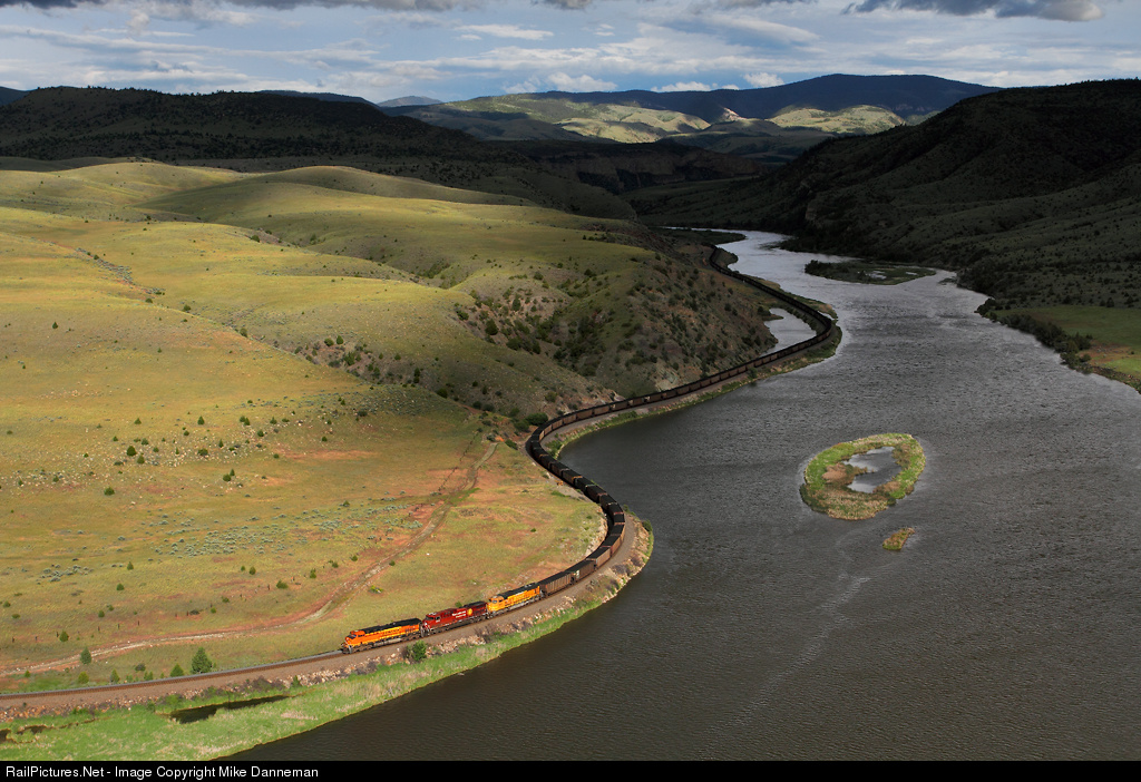 Shadows from numerous clouds darken the background in Lombard Canyon on the afternoon of June 17, 2014, as a BNSF coal train snakes along the Missouri River on Montana Rail Link’s Second Subdivision. BNSF GE ES44DC No. 7491 leads a leased Canadian Pacific GE AC4400CW and a BNSF EMD SD70MAC as head end power for the westbound train.