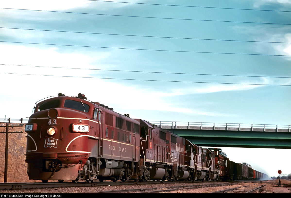 After its long dash across the high plains of eastern Colorado with westbound train 81, Rock Island F2A 43 is leaning on the brakes at Sable just east of Denver. In a few miles the train will come to a stop, switch from UP’s Kansas line to its own belt line taking it around the city’s northern edge and into Rio Grande’s North yards, the Rock’s home base in the Mile High City. Even confirmed diesel fans have trouble identifying EMD’s F2. Only 104 of these “interim” models rolled out of La Grange in five months of 1946, sandwiched between production of the pioneering FT’ and the best-selling F3. Rock Island bought a dozen, all A-units, and for some reason assigned them two-digit road numbers, the only such on the railroad.