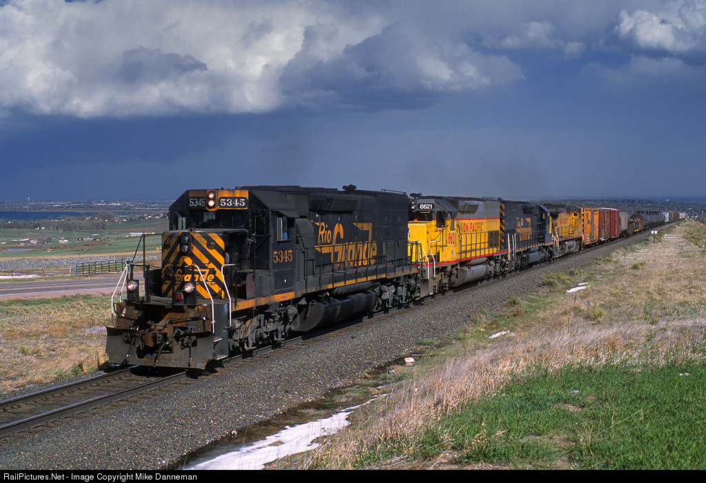 While afternoon storms roll onto the plains, a westbound Union Pacific freight pounds upgrade at mile 14.5 west of Leyden, Colorado, on April 14, 2001. Rio Grande EMD SD40T-2 No. 5345 leads the train, which includes UP No. 8621 (former D&RGW No. 5364), Rio Grande No. 5390 and UP GE AC4400CW No. 7093. Interestingly, the 5345 still has its Mars lights and class lights intact, in addition to more recently-added ditchlights.