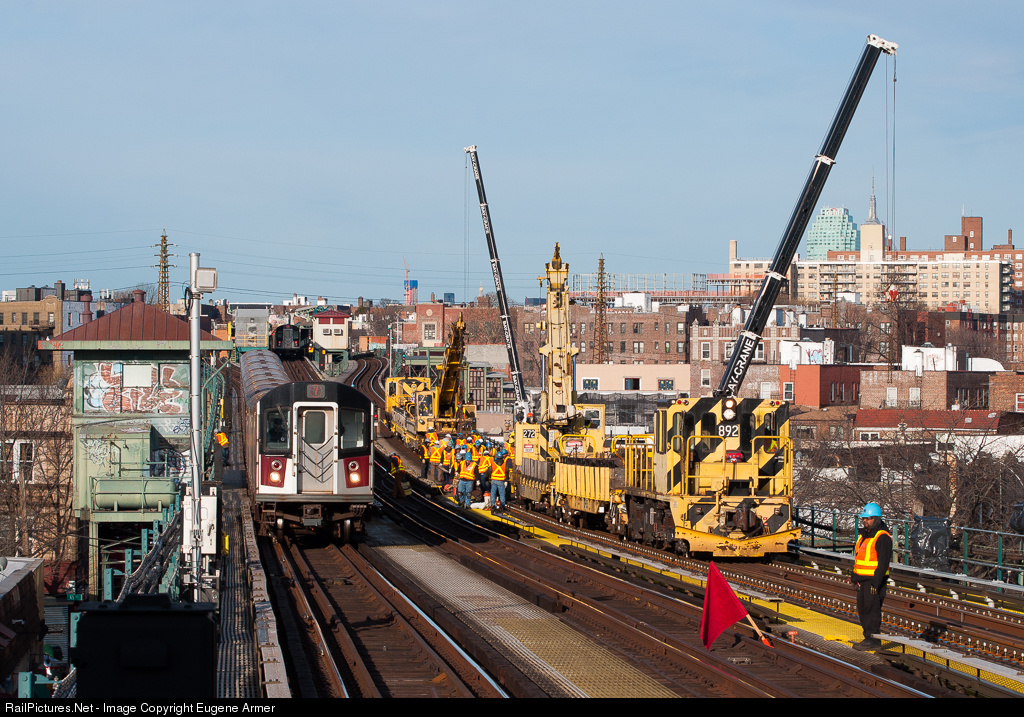 Weekend maintenance in progress on the Manhattan-bound Local track of the No.7 Flushing-Main Street line, between 61st Street-Woodside and 69th Street in Queens. The cranes are lifting new track panels into place from a stack on the street below. MTA R77 GE diesel #892 is closest to the camera. On the left, a Flushing-bound Local is approaching 69th Street, while in the background, a Manhattan-bound Local, running on the Express track to bypass the maintenance occupation, has stopped at the 61st Street-Woodside station.