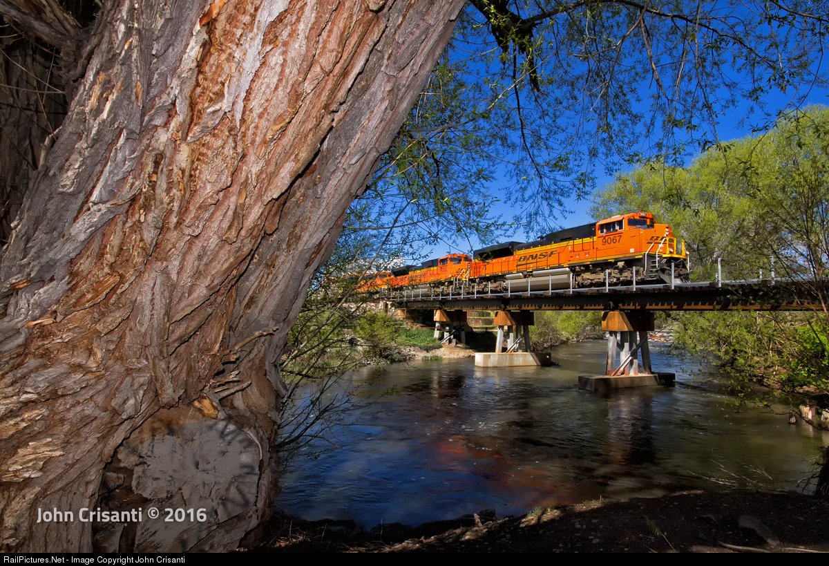 It's a gorgeous Monday morning as BNSF SD70ACe No. 9067 leads coal empties back to Buckskin Mine, Wyoming from Halsted, Texas over the Cache La Poudre River in Fort Collins, Colorado on May 02, 2016.