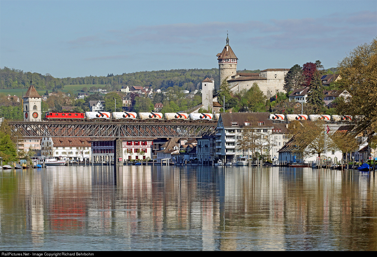 | A diverted freigth train Schaffhauen – Singen (Hohentwiel) is crossing the Rhine bridge. |