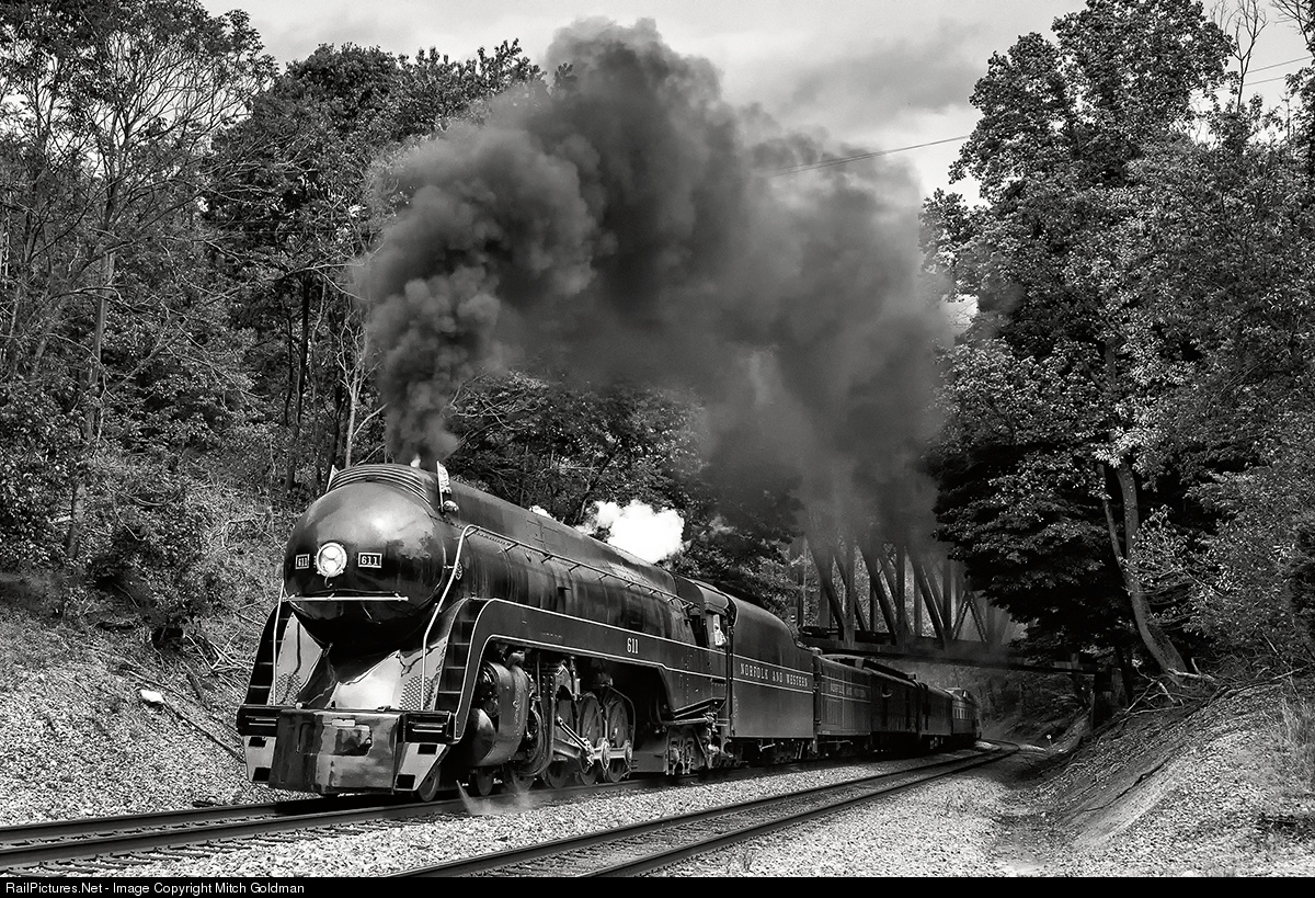 Norfolk & Western's venerable J-class No. 611 leads "the Pelican" through Wabun, VA on native rails ducking the still active ROW of the former Virginian on Sunday, May 8th, 2016. This was the fourth of four excursions which occurred over the weekend all originating from Roanoke, VA between May 7th and 8th, 2016.
