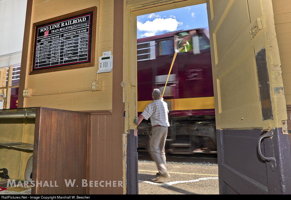 In a scene from the past, "Dresser OPR" Don Knudtson hoops up orders to engineer Max Medlin on one of many photo runbys put on by S&B Productions on a sunny day in May. Don is no stranger to hooping up paper, as he comes from a storied career as an operator/dispatcher for Milwaukee Road/Soo Line/Canadian Pacific.