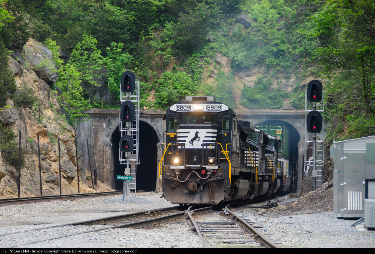 | A westbound Norfolk Southern freight pops out of Montgomery Tunnel where it is immediately photographed by several dozen people. No, there is nothing special about this train -- everyone was waiting for N&W 611 to appear a bit later. |