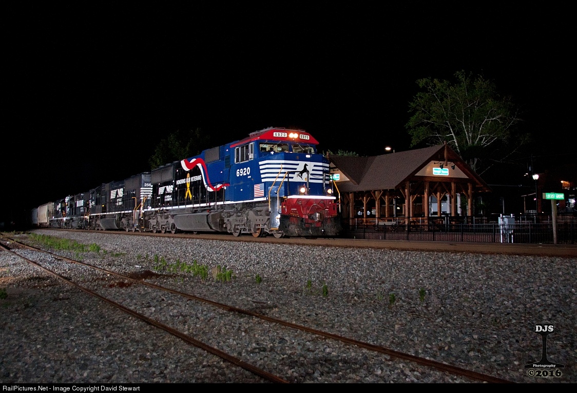 Norfolk Southern's "Honoring Our Veterans" SD60E NÂș6920 leads three other EMDs on M18 as it charges through downtown Locust Grove, Georgia with it's Macon, Georgia to Linwood, North Carolina extra manifest.