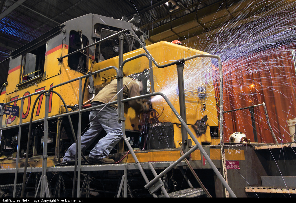A welder puts some elbow grease into it as he grinds fresh welds on repairs to the nose of Union Pacific SD40-2 No. 3071 at the Downing B. Jenks Shop in North Little Rock, Arkansas, on May 19, 2015. The locomotive is getting rebuilt into a SD40N, with the “N” in the designation coming from the NEXSYS control system by ZTR Control Systems used by UP in the rebuild to replace the older EMD Dash 2 component cards and system. UP also installs a remanufactured prime mover, along with reconditioned main generator, traction motors, trucks and other major components during the process. The cab is rebuilt, replacing worn out and rusted portions, and adding new doors, air conditioning, PTC capability and rewired electrical cabinets.
