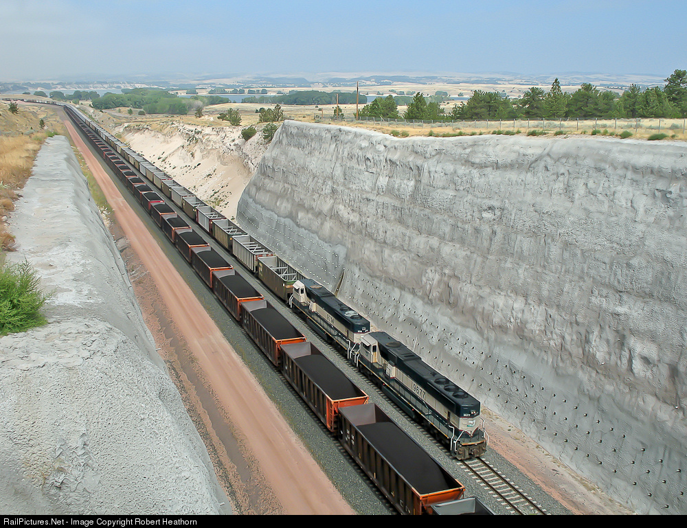 BN 9677 is the rear dpu on empty coal passing a loaded eastbound coal train in the big cut (daylighted tunnel) in Guernsey park. Taken from bridge on Skyline Drive. Note the stay bolds to hold the rebar and shotcrete in place.
