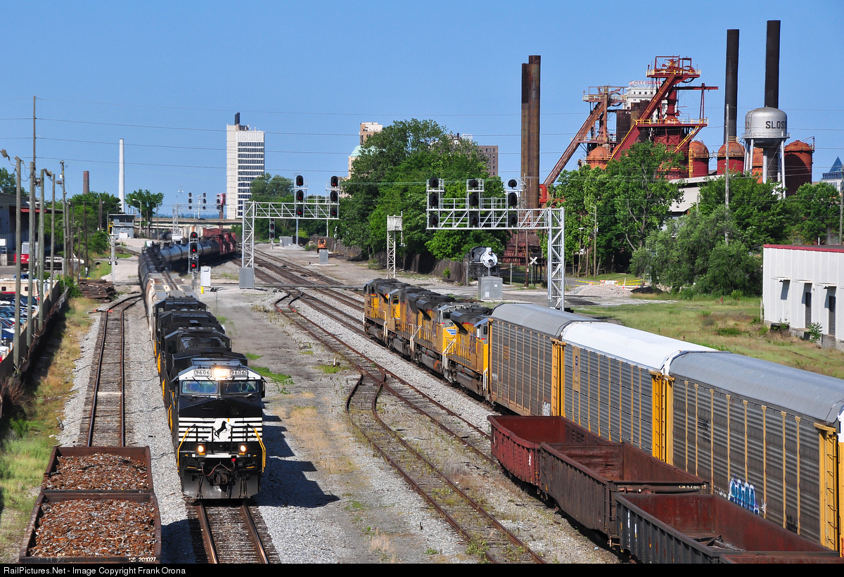 A meet between Northbound NS 130 and southbound NS 225 offers a great look at how two of the NS lines running through Birmingham converge near the 32nd street interlocker. Train 130 takes a diverging clear onto the East End District while the UP lead 225 holds on track 2 of the AGS South District. This view atop the 35th street bridge also shows off the newly operational signal cantilevers which consolidated the numerous dwarfs and stand alone signals that used to control this area commonly referred to as "the puzzle".