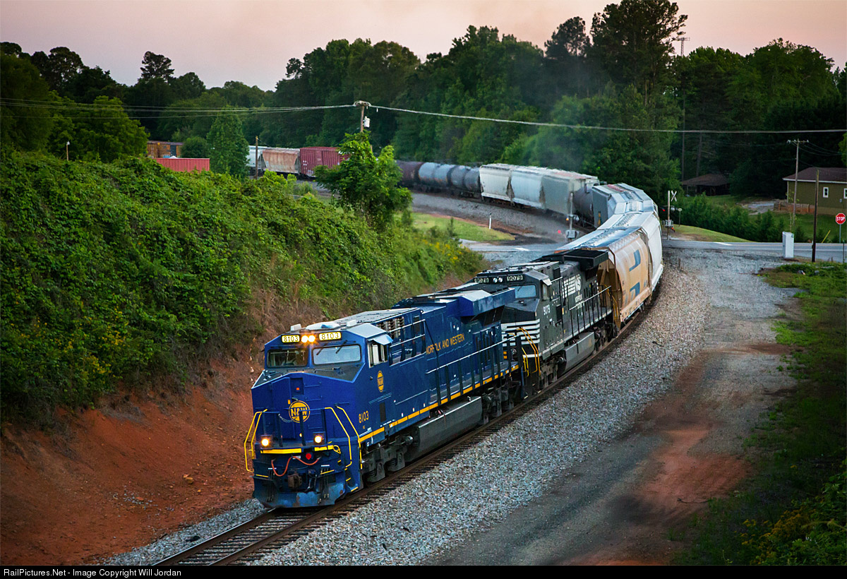 NS 118 navigates the sharp curve in Norris, SC with the Norfolk & Western heritage unit on point shortly after sundown as it heads northward to Linwood, NC.