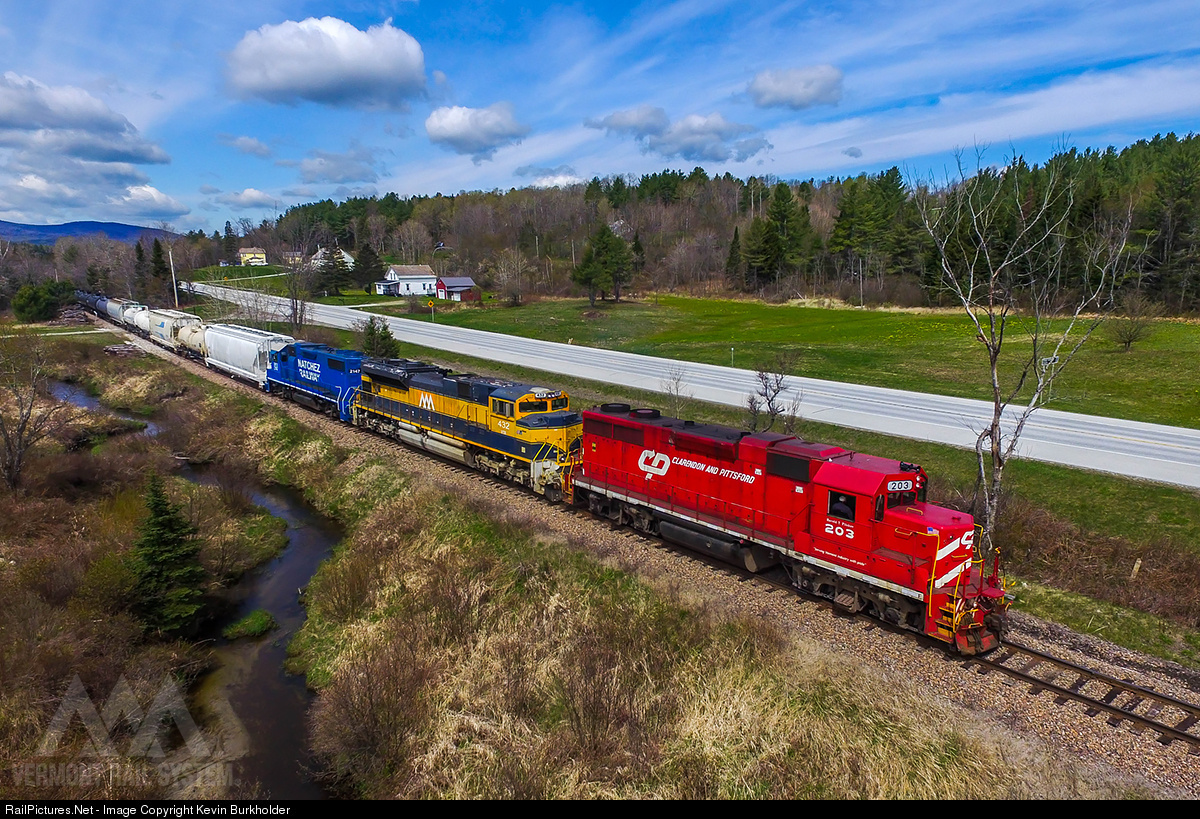 Freight traffic remains steady on the Vermont Rail System's Green Mountain Railroad, with an occasional extra being required to move tonnage between Rutland and Bellows Falls over the old Rutland Railroad route. On May 17, CLP GP38 203, VTR SD70M-2 432 and GMTX GP38-2 2147 (ex-Natchez Railroad 2601) team up to move 21 eastbound loads to Bellows Falls, where they would pick up twice that many cars for the westbound run back to Rutland.