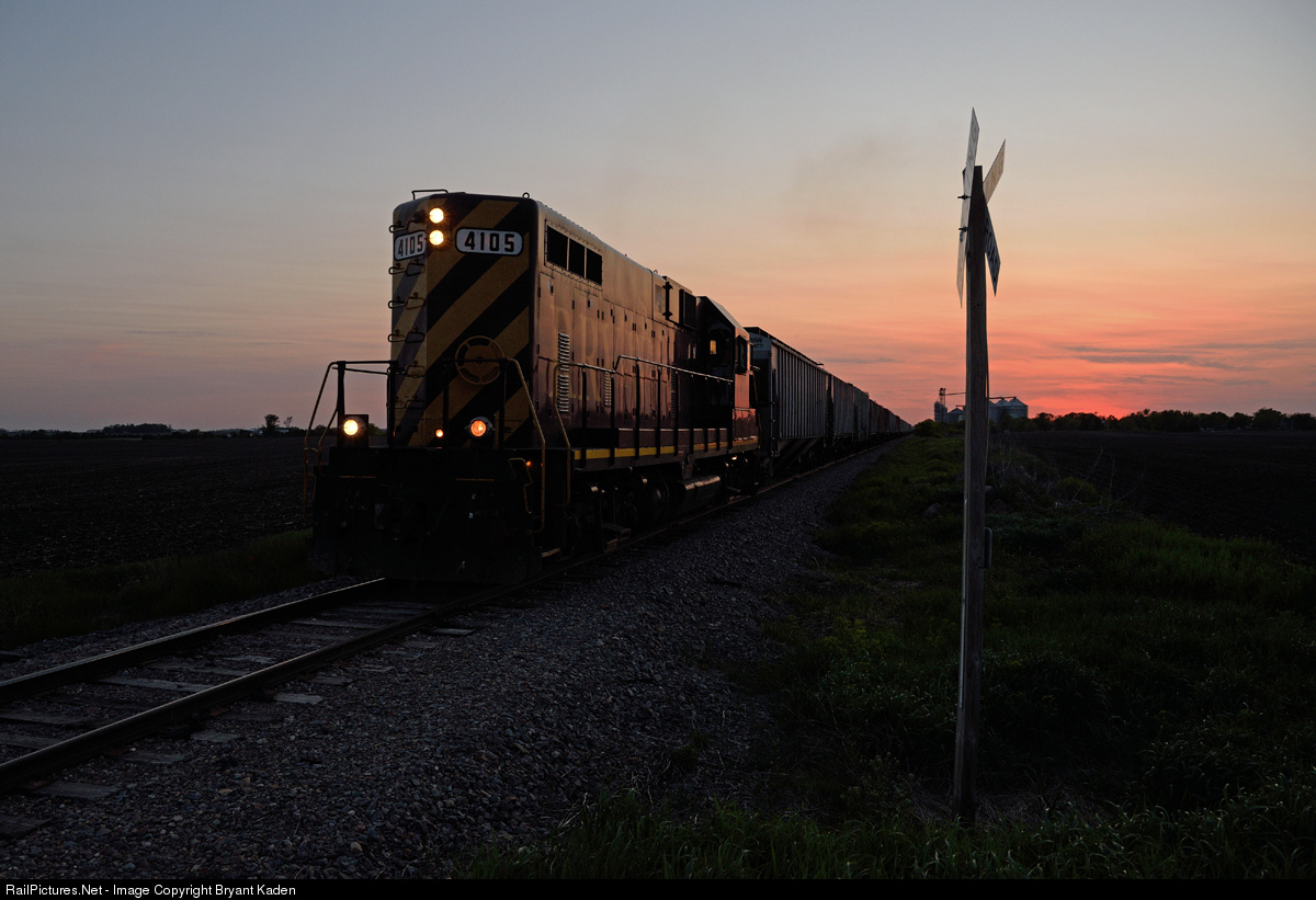 | As the sun sets on a beautiful spring day, a single Caterpillar powered GP15 chugs east out of Delhi with a string of cars loaded with corn. This former Minneapolis & St Louis line is now owned by the Minnesota Prairie Line and operated by the Twin Cities & Western. The western end of the railroad is used only as needed, with the elevator here at Delhi being the most reliable customer. |