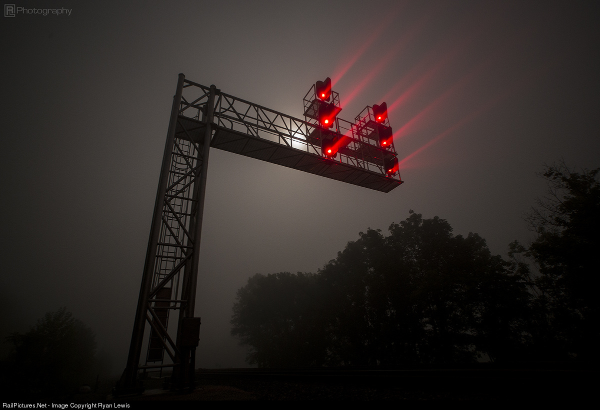 The signals at Belcher silhouetted against a dark and foggy sky.