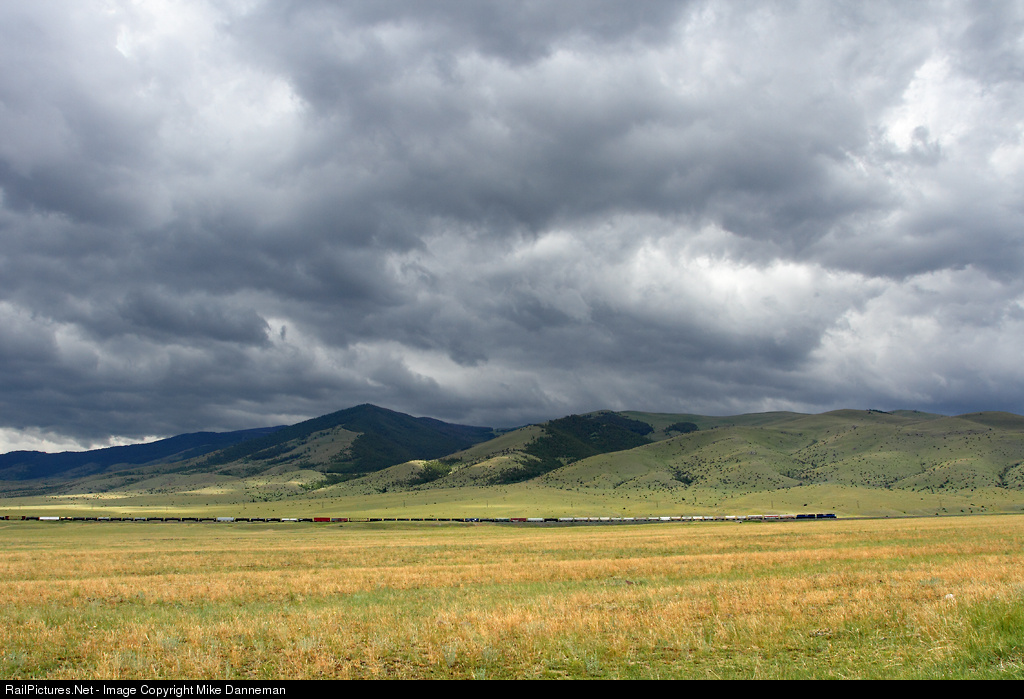 Montana Rail Link’s Laurel to Missoula road freight climbs up Winston Hill on June 19, 2014. Montana’s big skies are not always clear and blue—as seen with swirling storms over the mountains this late spring day—but it still big sky country!