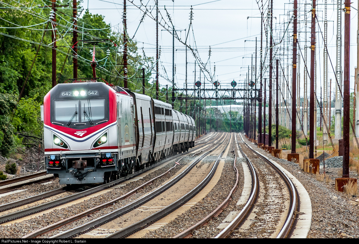 The Amtrak Cities Sprinter 642, sporting its distinctive "Salutes Our Veterans" paint scheme, hustles southward with train 91(22), the Silver Star. At Washington Union Station, the ACS-64 will be swapped out for diesels to continue the journey to Miami, Florida.