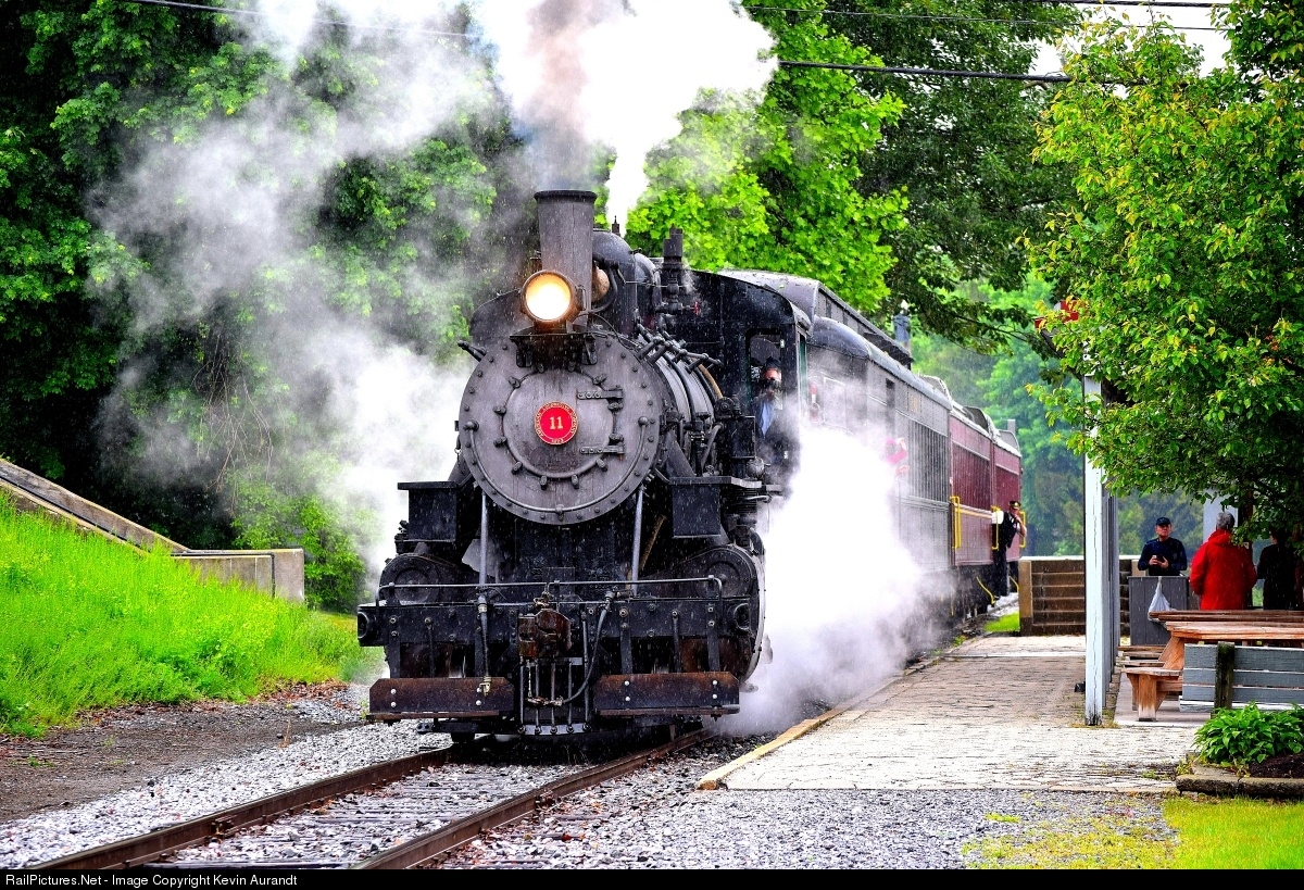 | Everett Railroad Alco #11 2-6-0 pulls 3 coaches full of riders into Roaring Spring Station, for a chance to get ice cream and take a look at the restored station. Even the steady rain did not dampen the spirits of the riders. |
