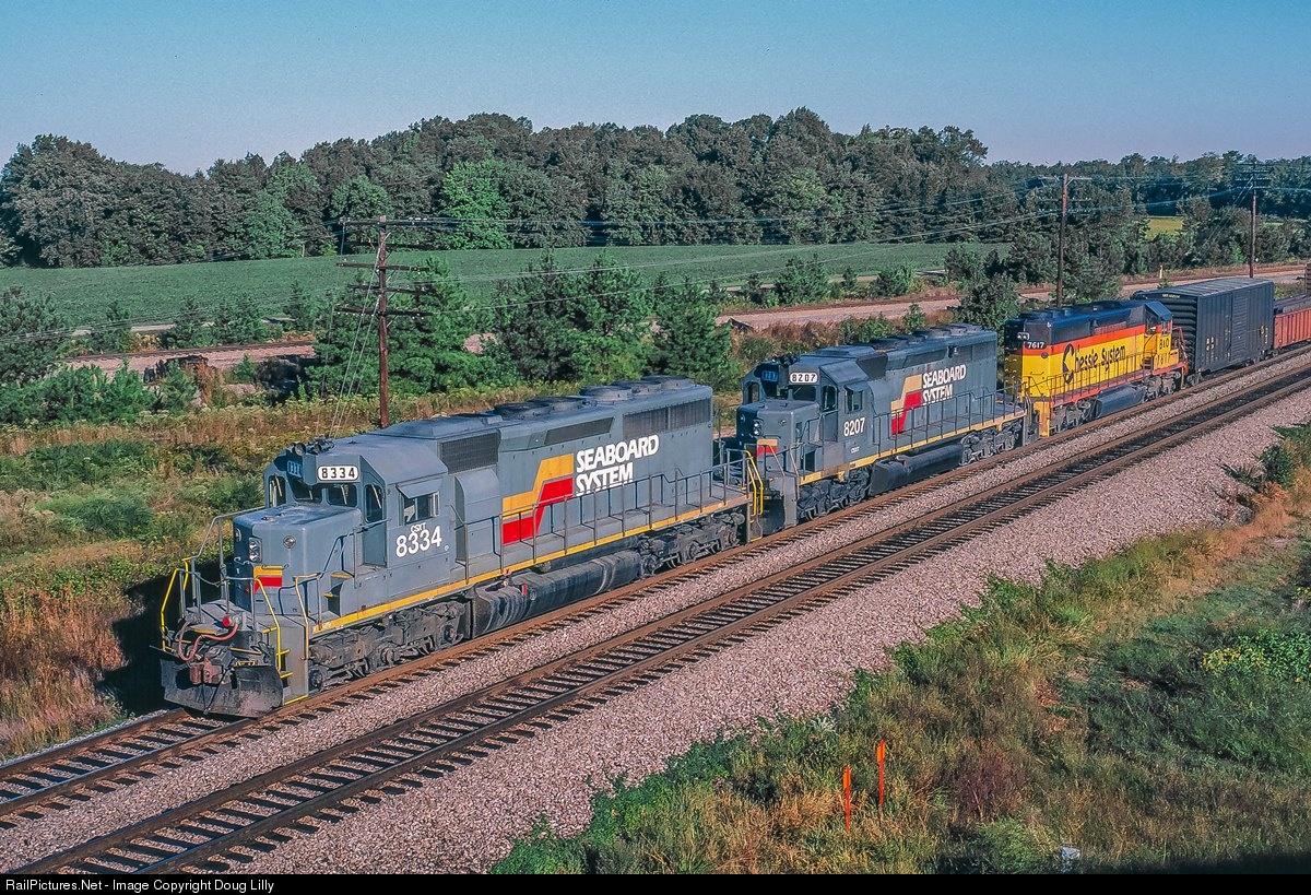 Some early CSX action is seen here with a southbound train departing Collier yard on the former Atlantic Coast Line. A subtly patched Seaboard System SD40 and an equally-subtly patched SD40-2 are accompanied by a “virgin” B&O SD40-2. Although a crew has been tearing up the Norlina Subdivision, the former Seaboard Air Line main line, northward from Norlina, NC for several months, the rails on the north end are still intact in the background.