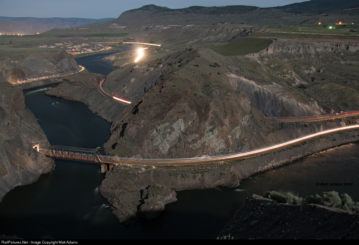 As we stood under the nearly-full moon on the bluff overhead the CP (background) and CN (foreground) mainlines through British Columbia, radio transmissions made it readily apparent we were about the get a rolling meet while our shutters were open. As the CP westbound, a loaded coal train, came out of the cut on their side, they killed their headlights. Why? They would have been shining them directly into the cab of the CN eastbound.