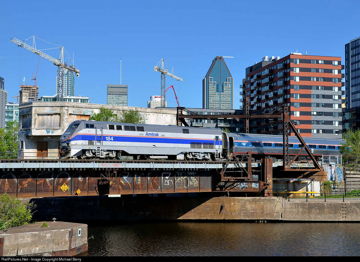 | Amtrak heritage back in Montreal two days later. Two days after leading the southbound Adirondack out of Montreal, heritage unit AMTK 184 is on the same run. Here it pushes the deadheading train towards Central Station as it passes Wellington tower about 75 minutes before departure from downtown Montreal. |