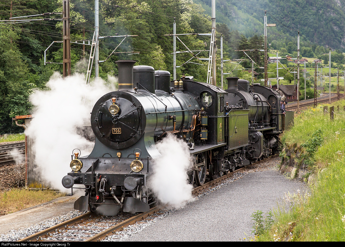 | Express train locomotive A 3/5 # 705 (4-6-0 four cylinder compound) and Gotthard freight train locomotive "Elephant" C 5/6 # 2978 (2-10-0 four cylinder compound) in Erstfeld. They are showed to the public during the opening event for the Gotthard Base Tunnel next weekend. |