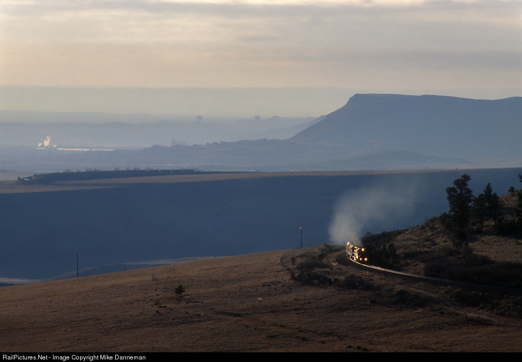 The Rio Grande Ski Train rounds the curve westbound out of Clay, Colorado, early on the morning of January 7, 2001. Big 10 Curve is visible on the mesa in the middle background, where the train was only a few minutes ago.