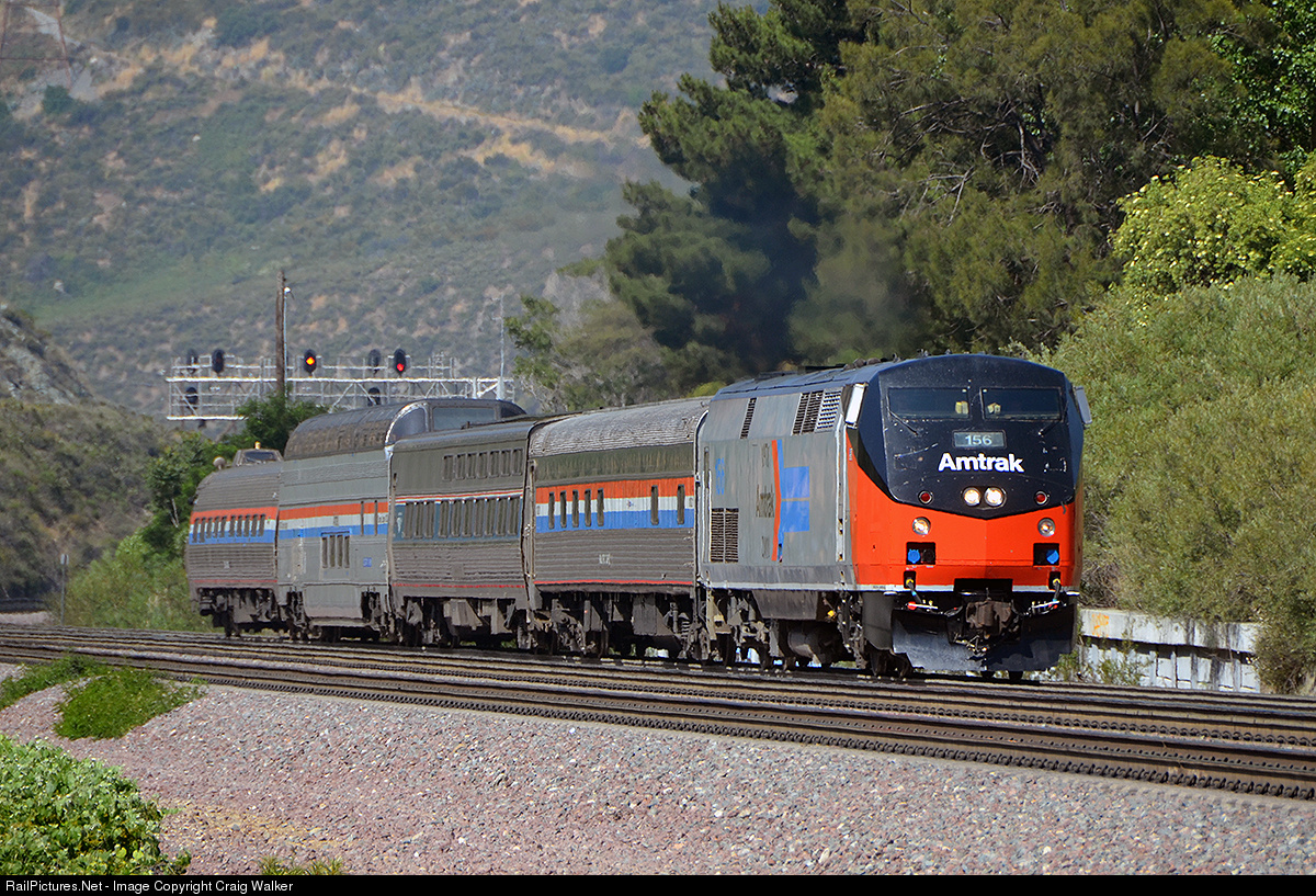 A short Amtrak train, operated for Amtrak President Joseph Boardman, climbs southern California's Cajon Pass on May 30th, 2016. This train, comprised of P42DC 156 (wearing the Phase I scheme it received as one of the carrier's 40th Anniversary engines in 2011), sleeper 10021 "Pacific Cape," Viewliner sleeper 62033, dome-lounge 10031 "Ocean View" and business car 10001 "Beech Grove", is operating from Los Angeles to Stockton, and the next day will continue on to Sacramento in order to accept delivery of the final Siemens-built ACS-64 electric locomotive.
