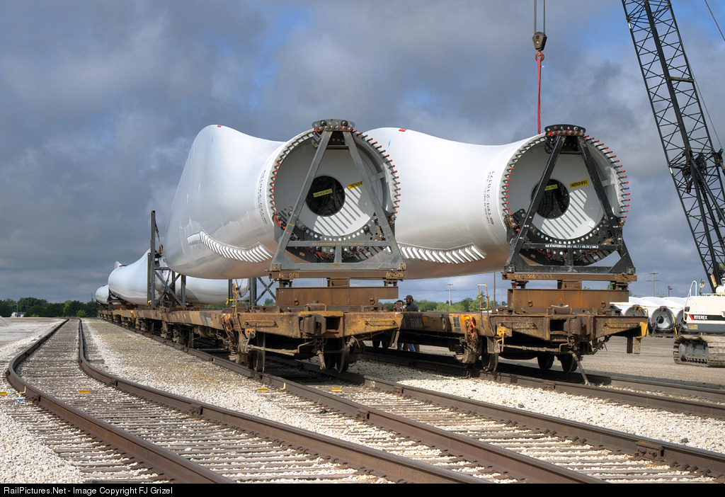 A load of 56.9 M wind generator blades has been loaded and waits for the IAIS crew to pull the loads and bring in some empties. The blade are bound for the UP in Des Moines, Iowa then on to Amarillo, Texas.