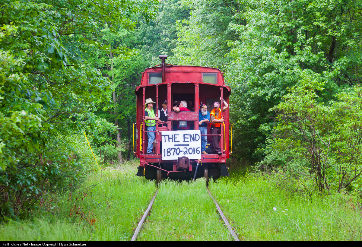 | After revenue runs ended, the Catskill Mt. Railroad ran one more train for employees and friends of the railroad. The train traveled from Kingston to the end of passable track. Here the train has just crossed Rt. 28A and is headed into the woods with ongoing rainstorms reinforcing everyone's mood about the railroad's fate. The sign is especially fitting, as this is almost guaranteed to be the last train to operate over these rails. |