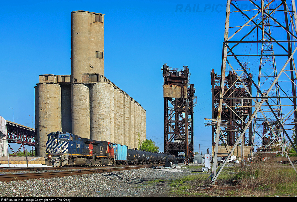 | BCOL 4645 East rolls across the ex-Pennsylvania Railroad lift bridge spanning the Calumet River at CP 509 on the Chicago Line. The two abandoned lift bridges on the right once hosted the NYC main line. And up until 1965, there was a fourth lift bridge spanning the Canal where the gap can be seen between there three bridges. There is also a bascule bridge on the far right once belonging to the B&OCT. |