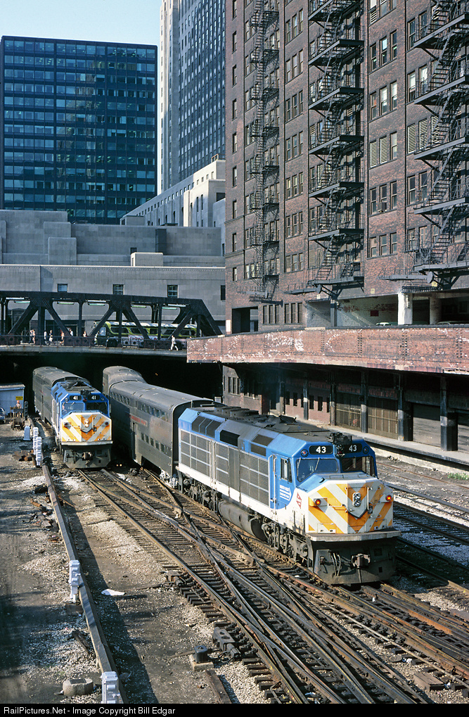 1979 was an interesting period in Milwaukee Road history, both in terms of commuter and freight railroading. Milwaukee was headed into bankruptcy, and by 1982 their commuter service would be taken over by RTA, then Metra. In the meantime, Milwaukee diesel power was pretty well worn and old F and Eunits needed replacing. A government trust called something like North West Suburban Trust was set up to finance 15 F40C locomotives for Milwaukee's suburban service. This spring 1979 view shows the original scheme, which by the mid 1980s would be replaced by Metra's blue. These would be the last commuter locos to carry Milwaukee's logo on their flanks. Unit 43 is pushing a rush hour train in to Union Station while 41 departs.