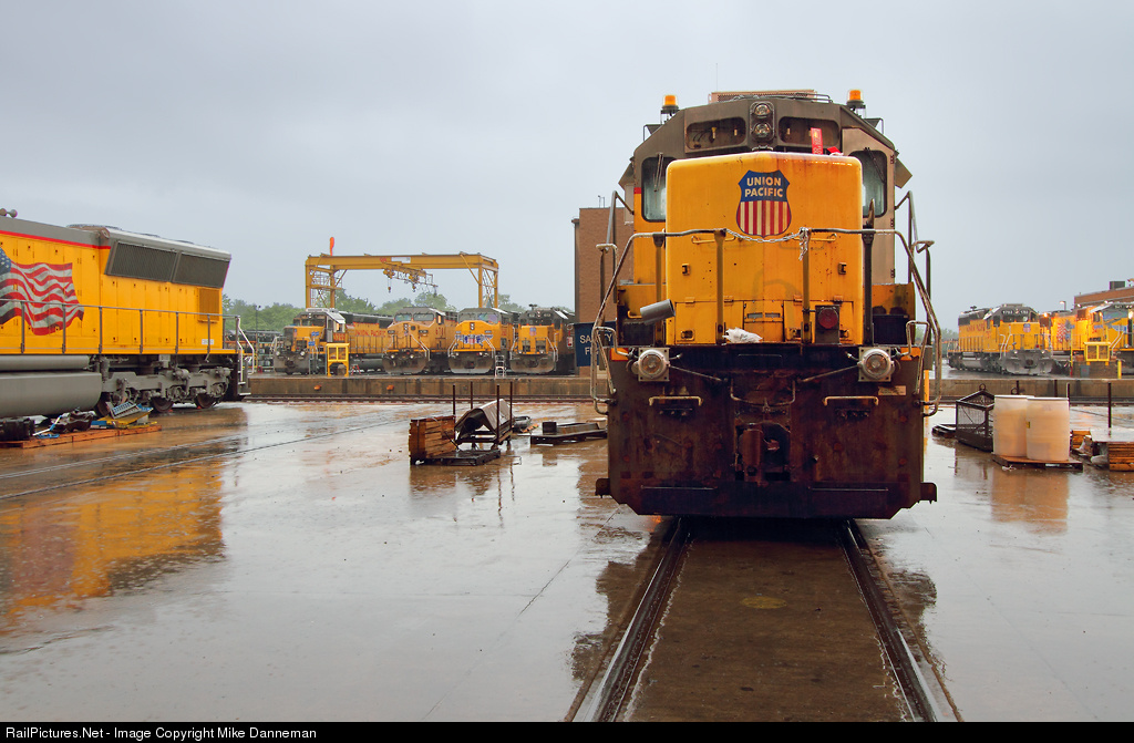 During a pouring springtime rainfall at North Little Rock, Arkansas, EMD SD40-2 No. 3361 is sitting just outside the main shop building at Union Pacific’s Downing B. Jenks Shop on May 20, 2015. A repainted SD70M is on the left, and a group of other locomotives line the other side of the north transfer table.