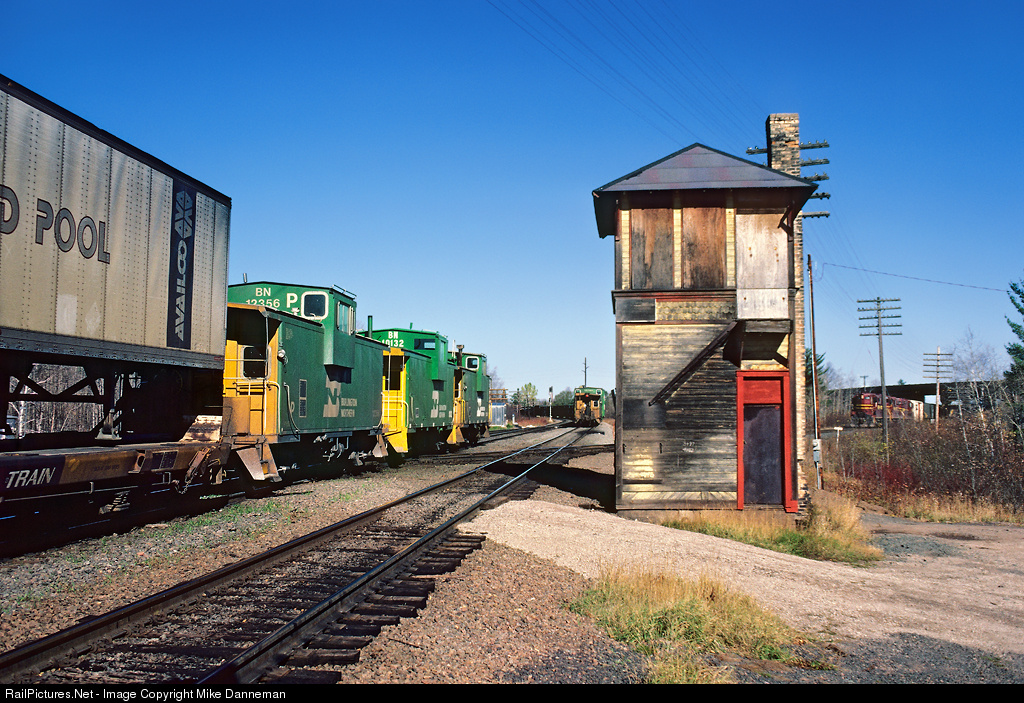 Cabooses on the end of two Burlington Northern trains pass MJ Tower on the south side of Superior, Wisconsin, on October 20, 1985. Waiting for all the BN action at the crossing to clear is Missabe’s Steelton Switch with three SD9s that is returning from interchanging cars with the Soo Line at their Stinson Yard. Why the southbound BN has three cabooses is unknown, but for now, they still reigned on the rear of Twin Ports’ trains. Today, the BN is BNSF and Missabe is CN, and the cabooses, diamond, tower and even the Highway 35 bridge (over the Missabe train) in the background are gone.