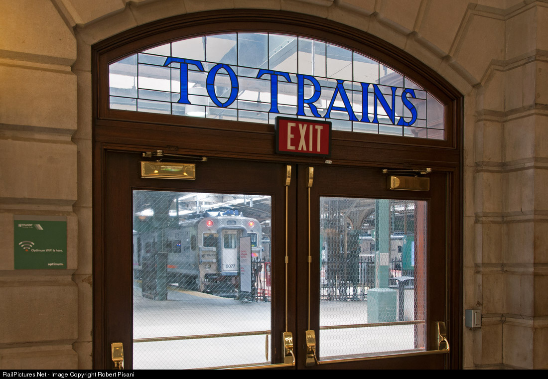| Hoboken Terminal presents a mix of classic and modern eras of railroading. The stained glass "To Trains" window and stonework of the waiting room contrast with the stainless steel Comet V cab car and WiFi service signage. |