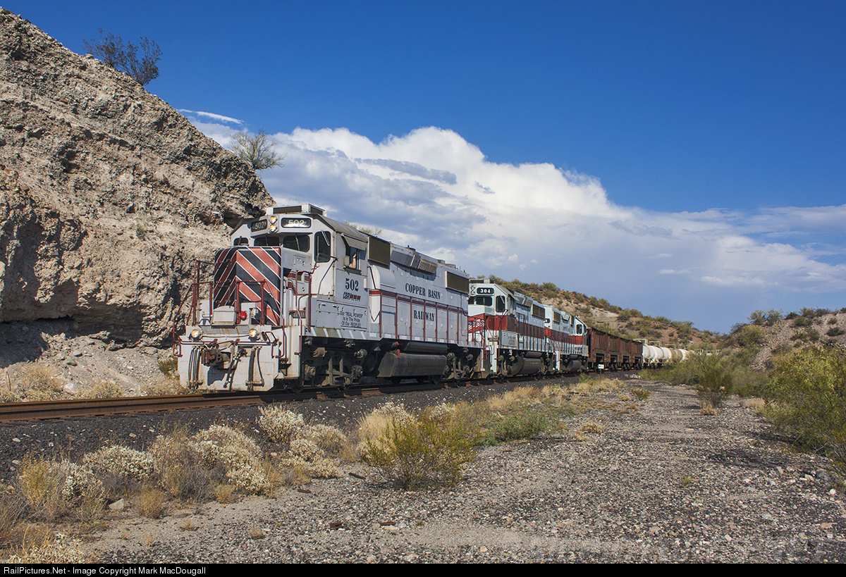 | Copper Basin's "Unit Train" of acid carrying tank cars heads down the Hayden Spur towards the Main Line at Hayden. This train is carrying cars from the smelter at Hayden to the Mine at Ray for use in the copper extraction process. Leading the way is CBRY GP39-2 502, an ex-Kennecott Copper unit still wearing the old Copper Basin paint scheme. |