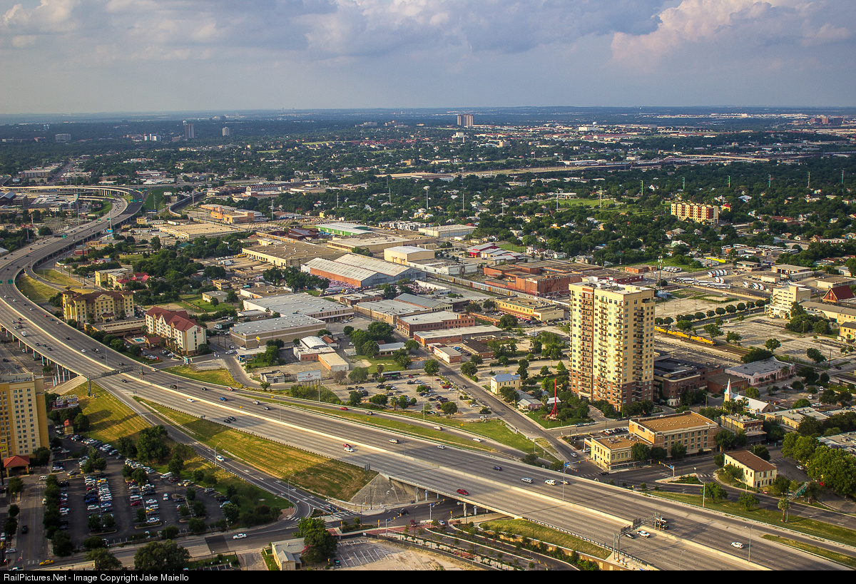 | In an episode of "spot the train", a Union Pacific autorack train is viewed from six hundred and twenty two feet up in the air, atop of the iconic Tower of the Americas. The train is currently splitting through downtown San Antonio on former Southern Pacific trackage just before hooking around at Tower 112 and proceeding onto the old Missiouri Pacific. |