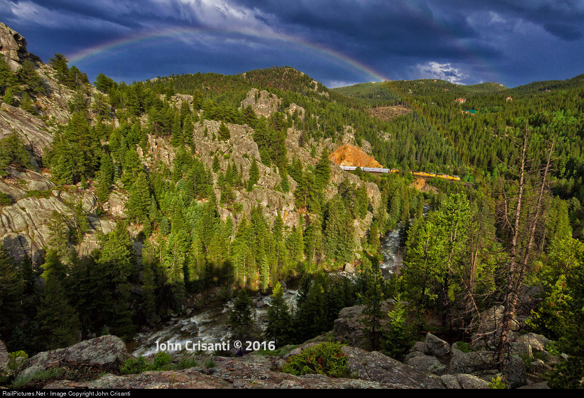 Railfanning is all about luck, and today... luck was definitely on my side. After getting pelted by heavy rain and hail for a few minutes, the sound of the RBBB Circus Train could be heard and the sun came out. However, the train was going so slow it ended up stalling out in the only open spot along the trees next to the tracks. As the train stopped, a rainbow appeared. The crew put the second motor online and proceeded ahead to Pinecliffe, Colorado to meet the eastbound Amtrak. The train is stopped at the daylighted Tunnel 28 and will soon enter Tunnel 29 on June 13, 2016.