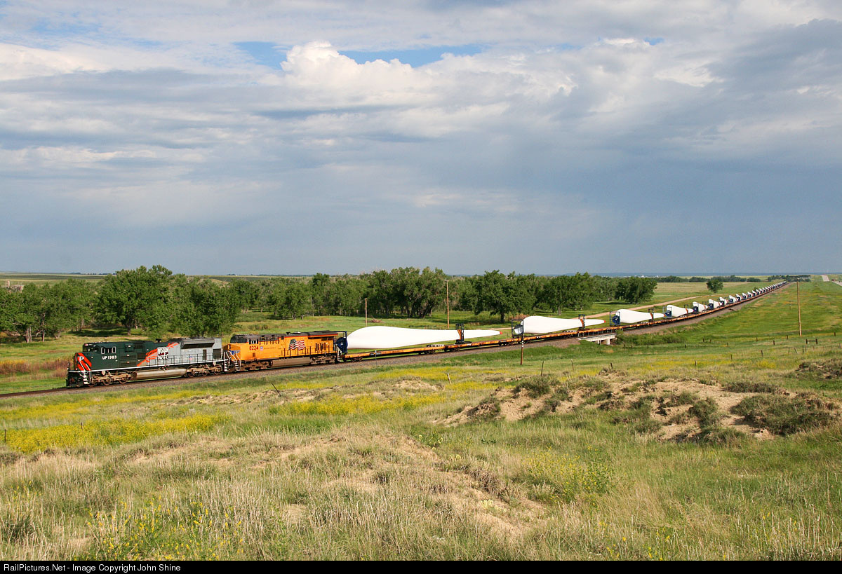 The Western Pacific Heritage engine leads a train of Windmill blades just East of Limon.