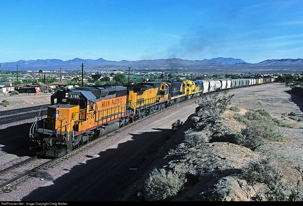 Entering Barstow, California, is a Union Pacific westbound with a varied power consist: UP SD40-2 3788, Chicago & North Western Dash 9-44CW 8681, GECX (ex-ATSF) C30-7 8044 and Santa Fe SDF40-2 5254 (ex-Amtrak SDP40F 635).