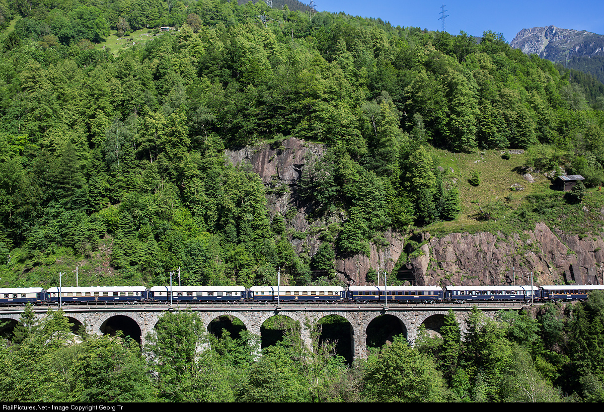 One of the most luxurious trains in the world, the Venice Simplon-Orient-Express, is crossing the 120 meter long Secken viaduct on the Gotthard north ramp on the way from Calais via Paris-Basel-Chiasso to Venice. In the picture are dining, bar, pullman and sleeping cars.
