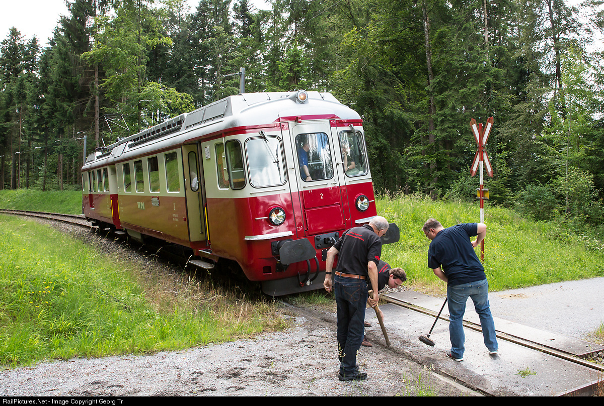 | Railcar BDe 4/4 # 2 of the DSF (built in 1966 for the former Wohlen-Meisterschwanden Bahn) stopped before the grade crossing in the middle of the wood, on the rather seldom used line Hinwil - Bäretswil. The flange ruts are filled with sand and gravel and had to be cleaned out. Work is done by the driver, a helper and the reveler of this birthday party himself (right). |
